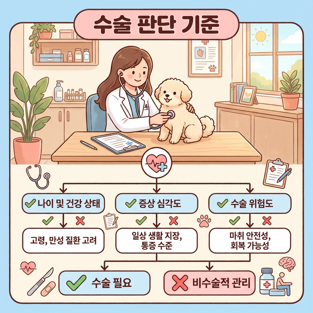 A. 1기 단독이라면 체중 관리와 환경 개선으로 관리 가능해요. 하지만 2기 후반~3기 이상이거나 통증·파행이 반복된다면 수술을 강력히 권장해요. 방치할수록 연골 손상이 비가역적으로 진행되거든요.