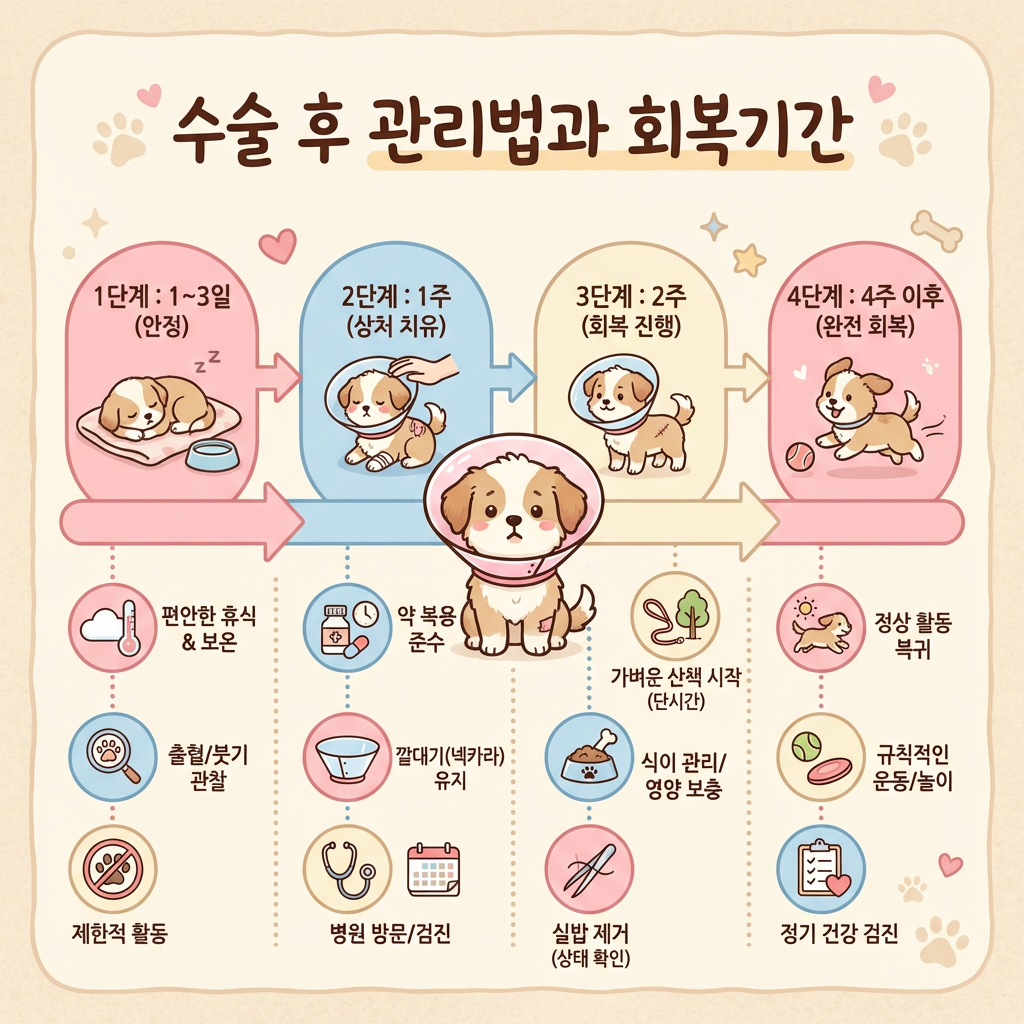 수술이 끝나면 진짜 싸움은 그때부터 시작이에요. 마취에서 깨어나는 과정에서 강아지가 비틀거리거나 울음소리를 내면 보호자 마음이 무너지거든요. 하지만 이건 정상적인 각성 반응이니 너무 당황하지 마세요. 병원에서 1~2시간 회복 후 당일 퇴원하는 경우가 대부분이에요.