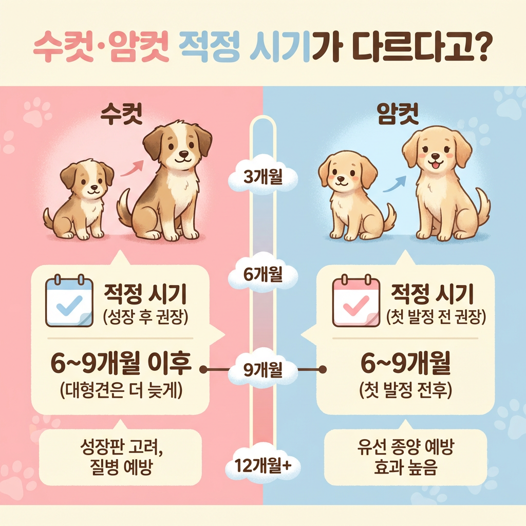 A. 소형견 수컷은 생후 4~6개월, 암컷은 5~7개월이 일반적으로 권장돼요. 대형견은 골격 성장이 완료되는 12~18개월 이후가 안전한 시기로 알려져 있고, 견종과 건강 상태에 따라 수의사와 상담 후 결정하는 것이 가장 정확해요.
