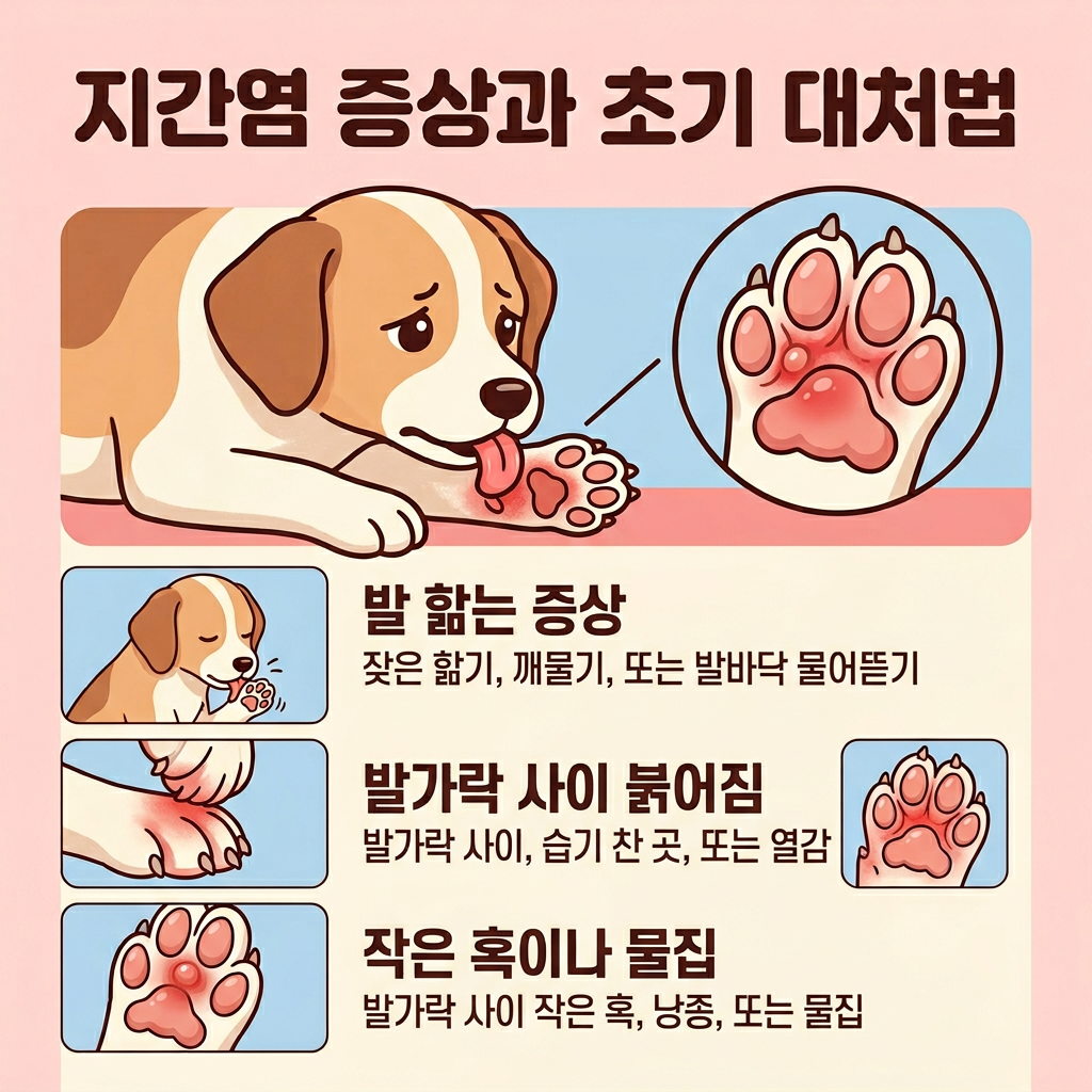 지간염은 강아지 발바닥이 빨개지는 가장 흔한 원인 중 하나예요. 말 그대로 발가락과 발가락 사이 피부에 염증이 생기는 질환이에요. 흔히 '발사탕'이라고 불리는 증상이기도 하죠. 발가락 사이가 붉게 달아오르고 부어오르면서 강아지가 그 부위를 계속 핥거나 깨무는 행동을 반복해요.