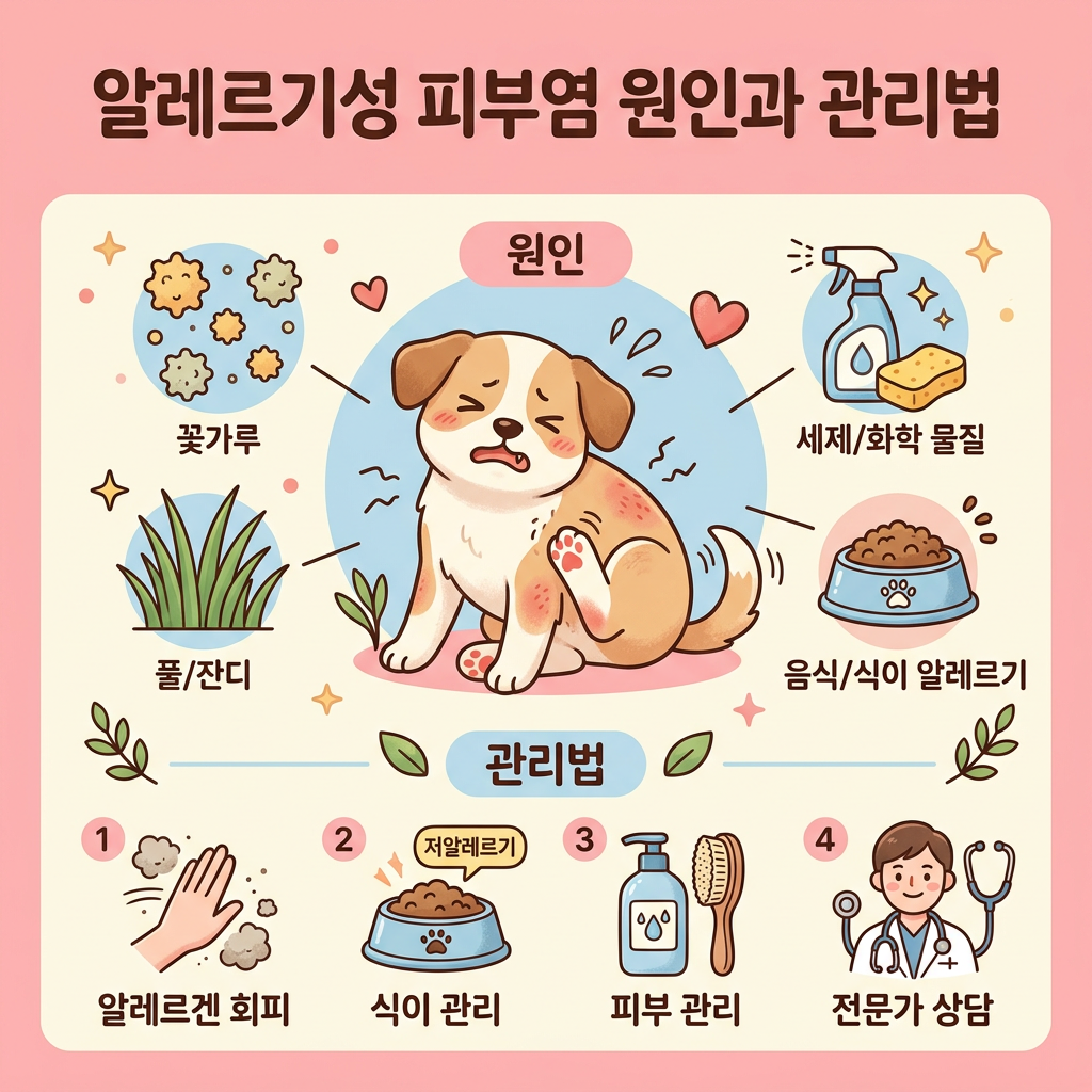 위 4가지 중 2개 이상 해당되면 알레르기 가능성이 높아요. 동물병원 피부과 전문 진료를 권장해요.