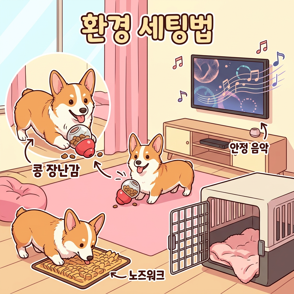 훈련만큼 중요한 게 환경 설계예요. 아무리 훈련을 잘해도 공간이 지루하고 자극이 없으면 불안이 채워질 틈이 생겨요. 아래 방법들을 조합해서 적용해보세요.