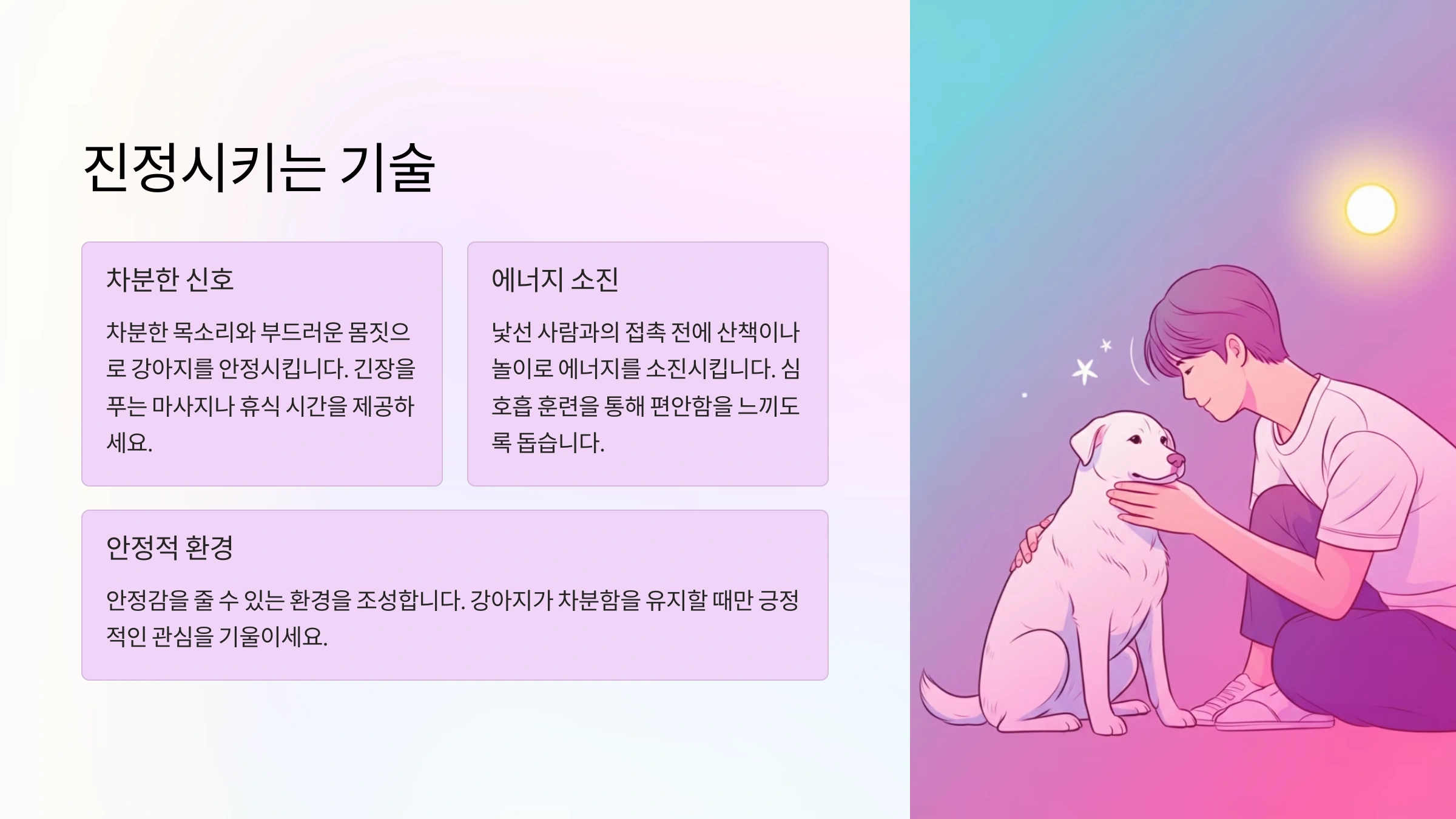 적절한 진정 기술은 강아지와 주인의 관계를 강화하며, 강아지의 스트레스를 줄이고 평온한 환경을 유지하는 데 효과적입니다.
