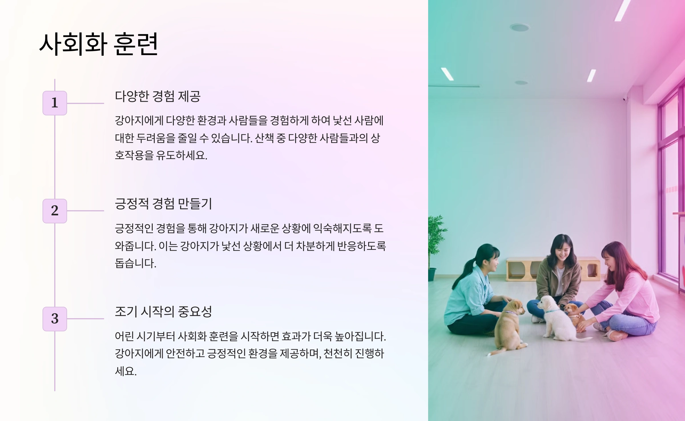 어린 강아지일수록 사회화 훈련의 효과가 더 크므로, 가능하면 생후 3-4개월경부터 시작하세요.