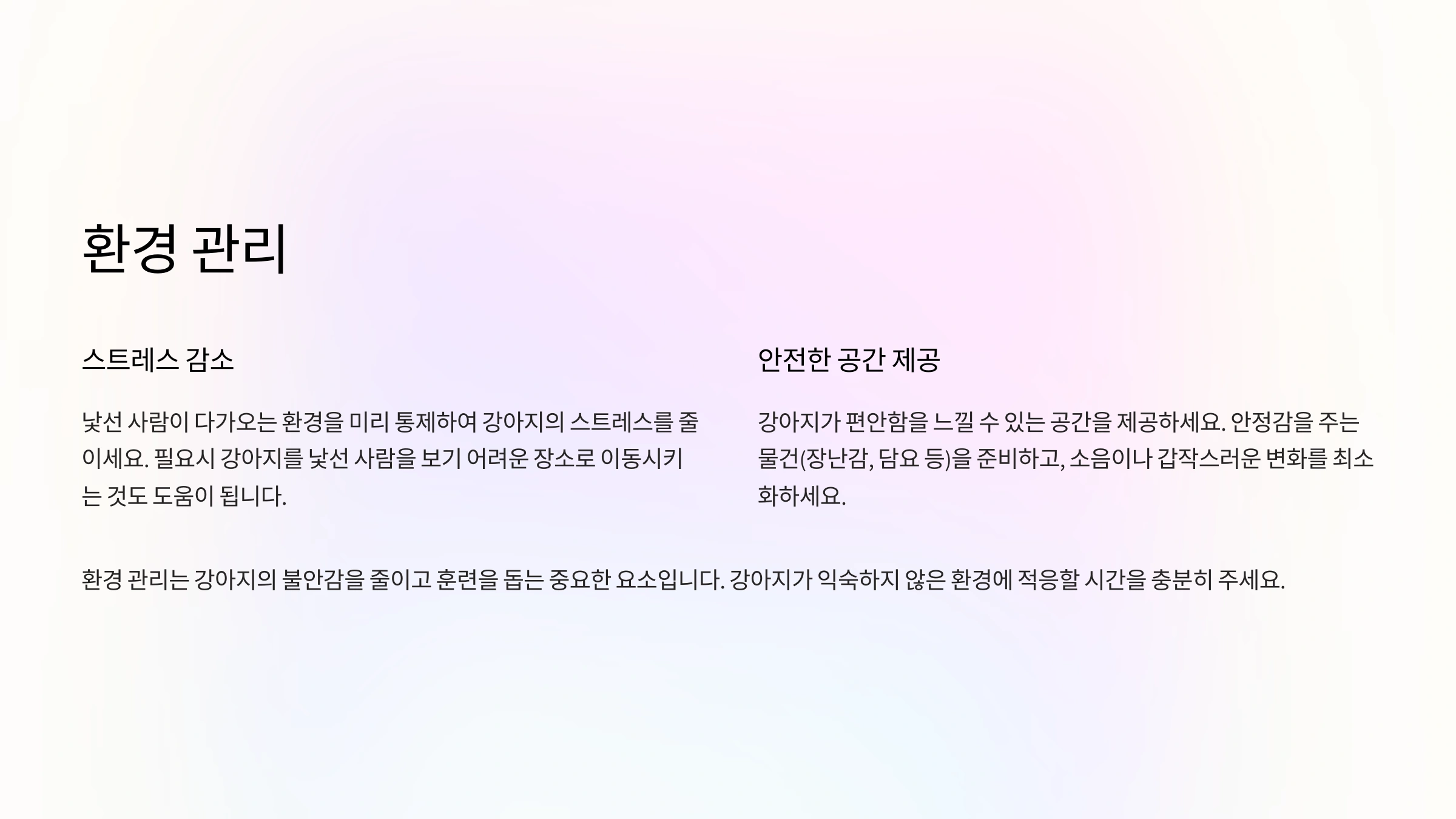 환경 관리는 강아지의 불안을 최소화하고, 짖는 행동을 예방하는 데 필수적인 요소입니다.