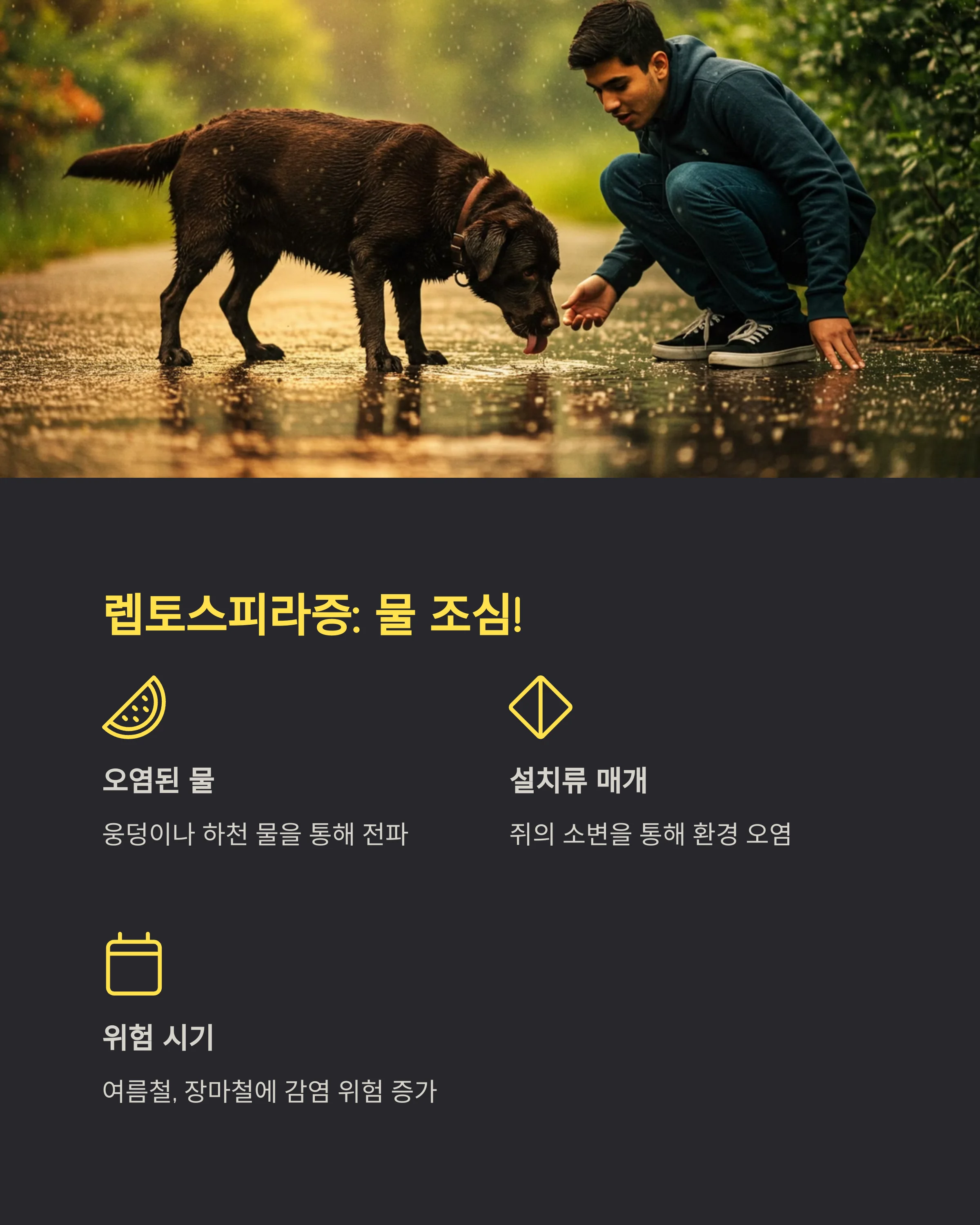 또한 렙토스피라증은 오염된 물이나 배설물을 통해 전파되는 세균 감염 질병으로, 반려동물뿐 아니라 사람에게도 발열, 근육통, 간·신장 손상을 일으킬 수 있어요. 특히 여름철 장마 시즌이나 습한 날씨에는 감염 위험이 높아져요.