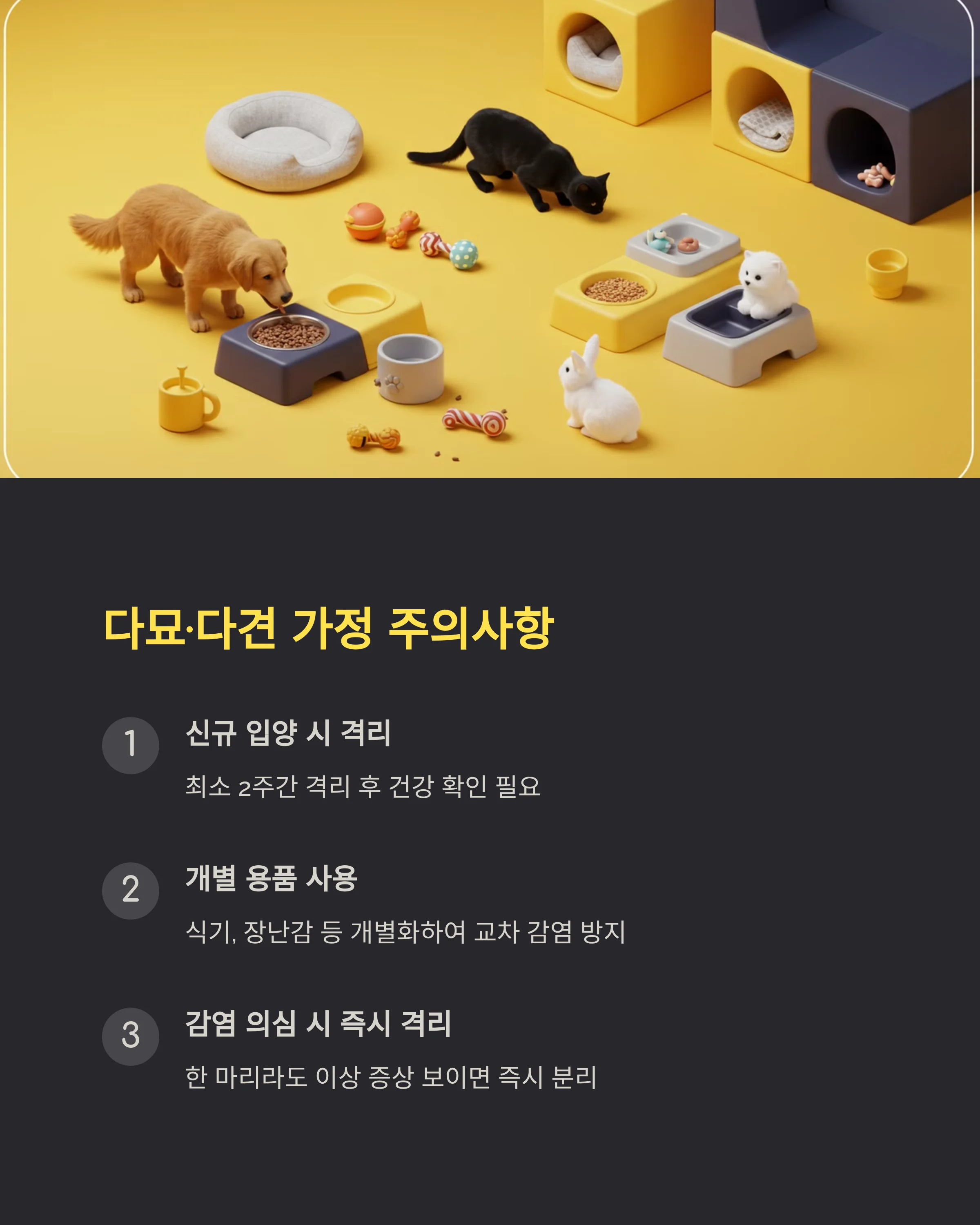 생활 공간을 청결하게 유지하고, 다묘/다견 가정에서는 신입 반려동물을 들이기 전 격리 및 검사를 진행하는 것도 매우 중요한 예방 수칙이에요. 위생과 예방, 이 두 가지가 우리 반려 친구들의 건강을 지키는 가장 큰 무기랍니다! 🐾