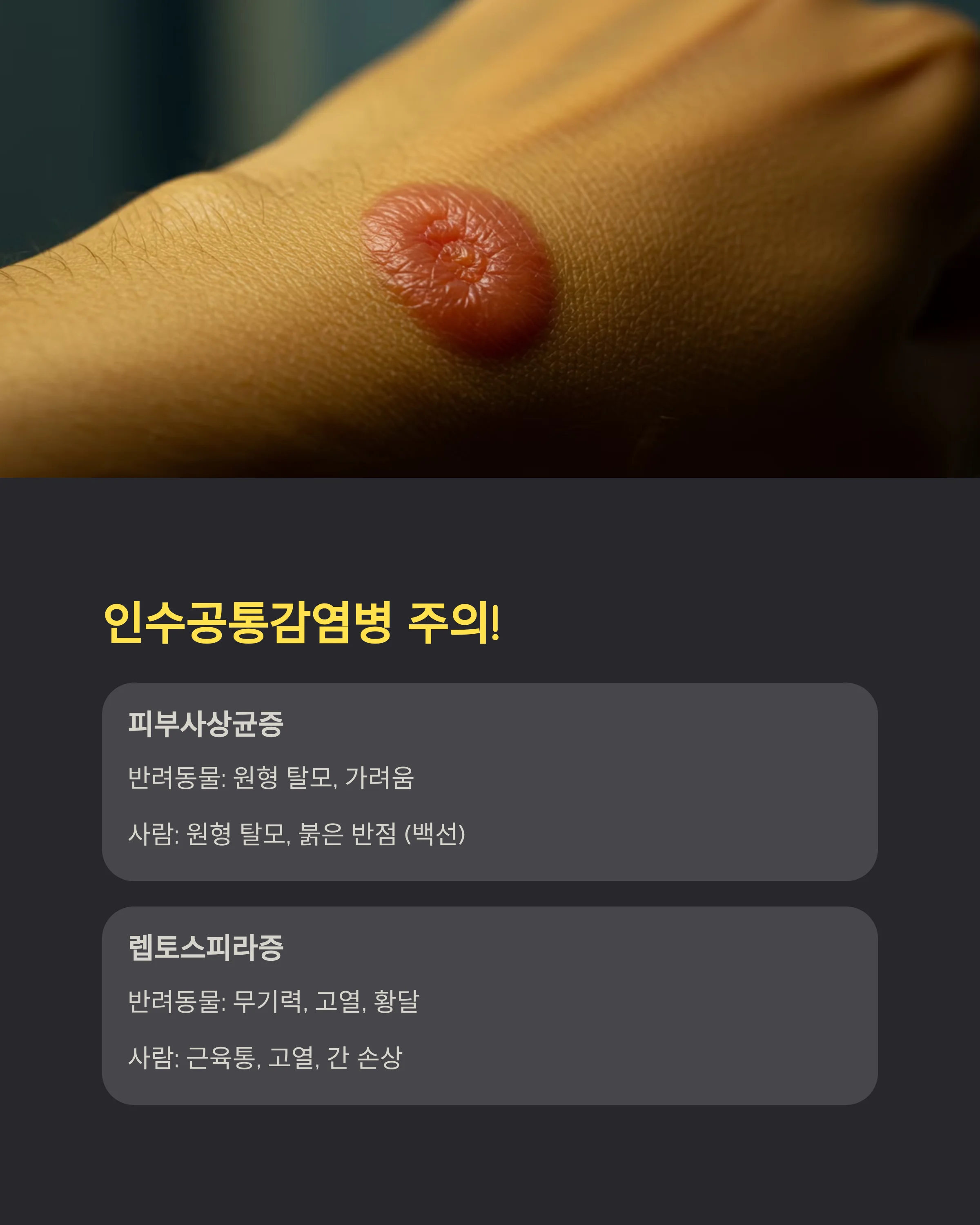 강아지와 고양이가 공유하는 전염병 중에는 사람에게도 전파될 수 있는 인수공통감염병이 있어요. 이런 질병은 반려동물 보호자뿐 아니라 주변 사람들까지 위험에 노출시킬 수 있답니다. 대표적으로는 피부사상균증과 렙토스피라증이 있어요.