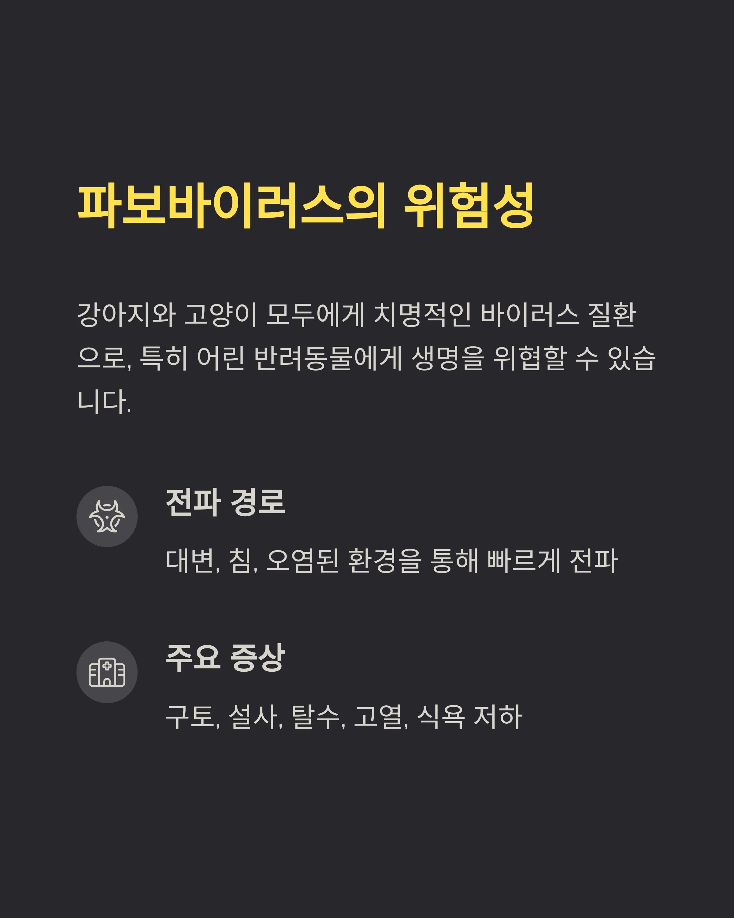 감염되면 강아지는 심한 구토와 설사, 탈수 증상을 보이고, 고양이 역시 식욕 저하, 고열, 백혈구 감소 등이 나타나요. 치료 없이 방치하면 짧은 시간 안에 상태가 급격히 악화될 수 있어서, 즉시 병원에 가야 해요.