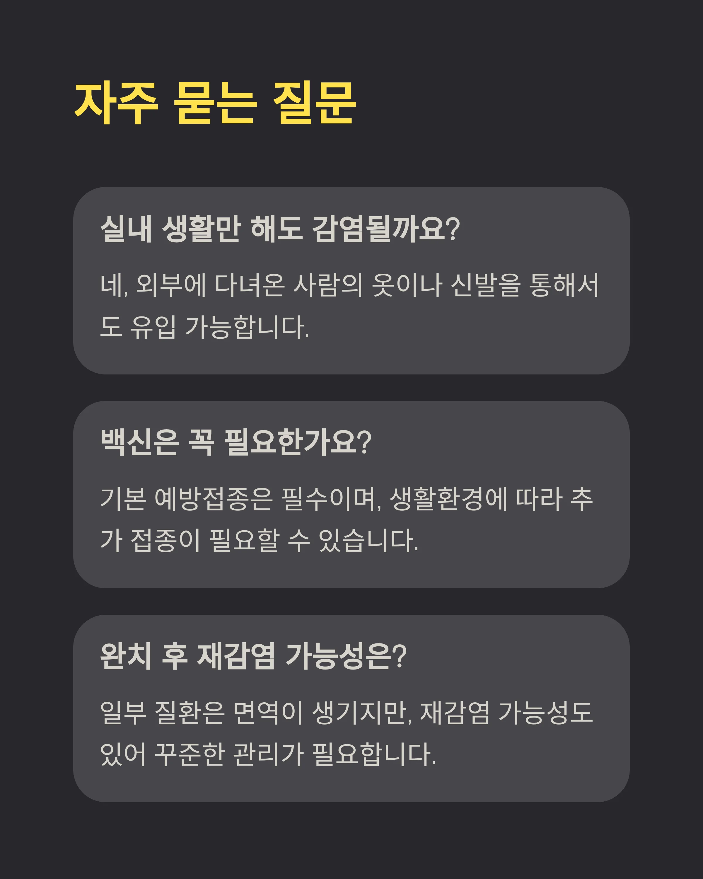 A7. 일부 질환은 면역이 생기지만, 일부는 재감염 가능성이 있어요. 꾸준한 관리가 필요해요.
