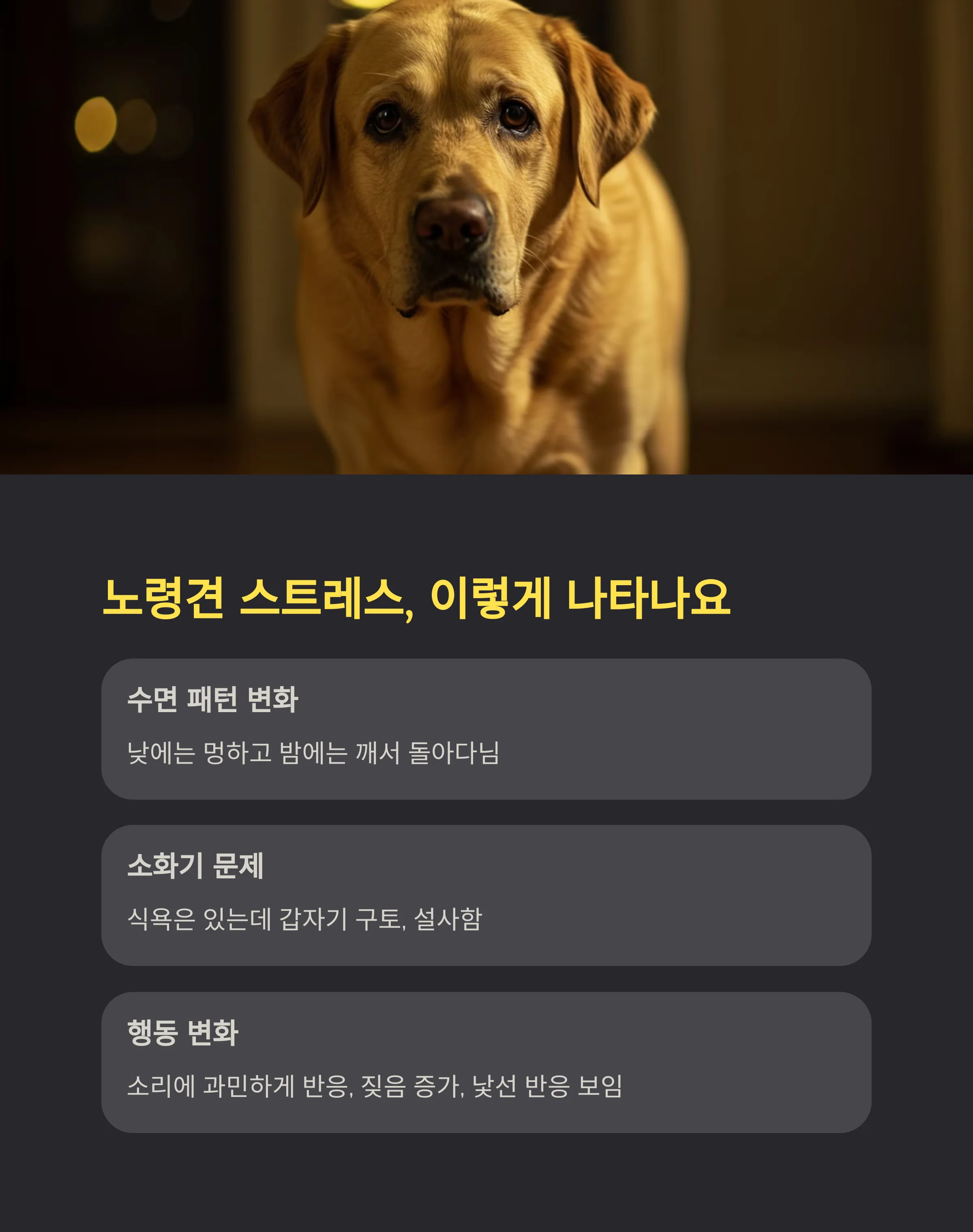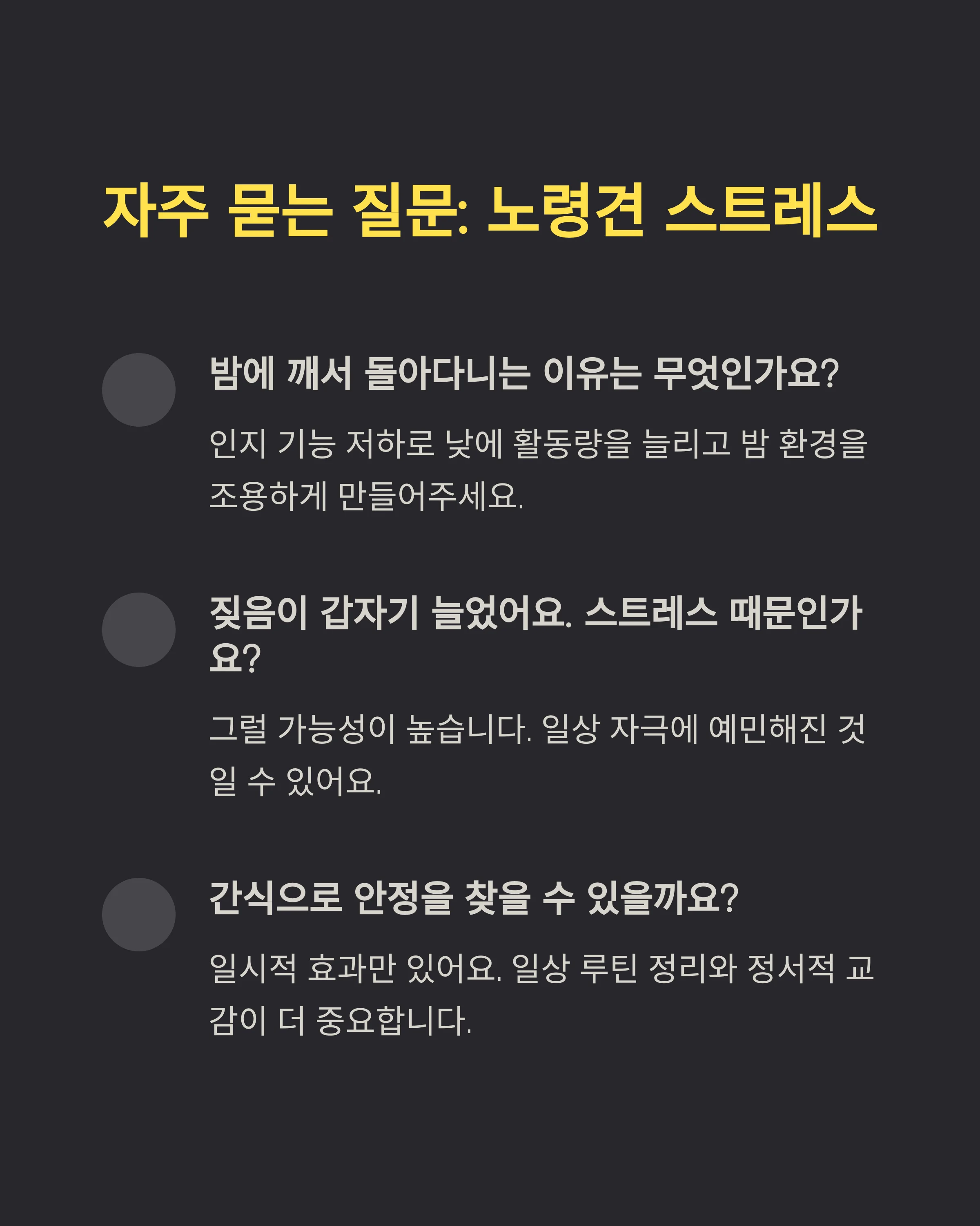 노령견 스트레스는 생각보다 다양한 방식으로 나타나요. 짖음 증가, 예민한 반응, 낯선 행동