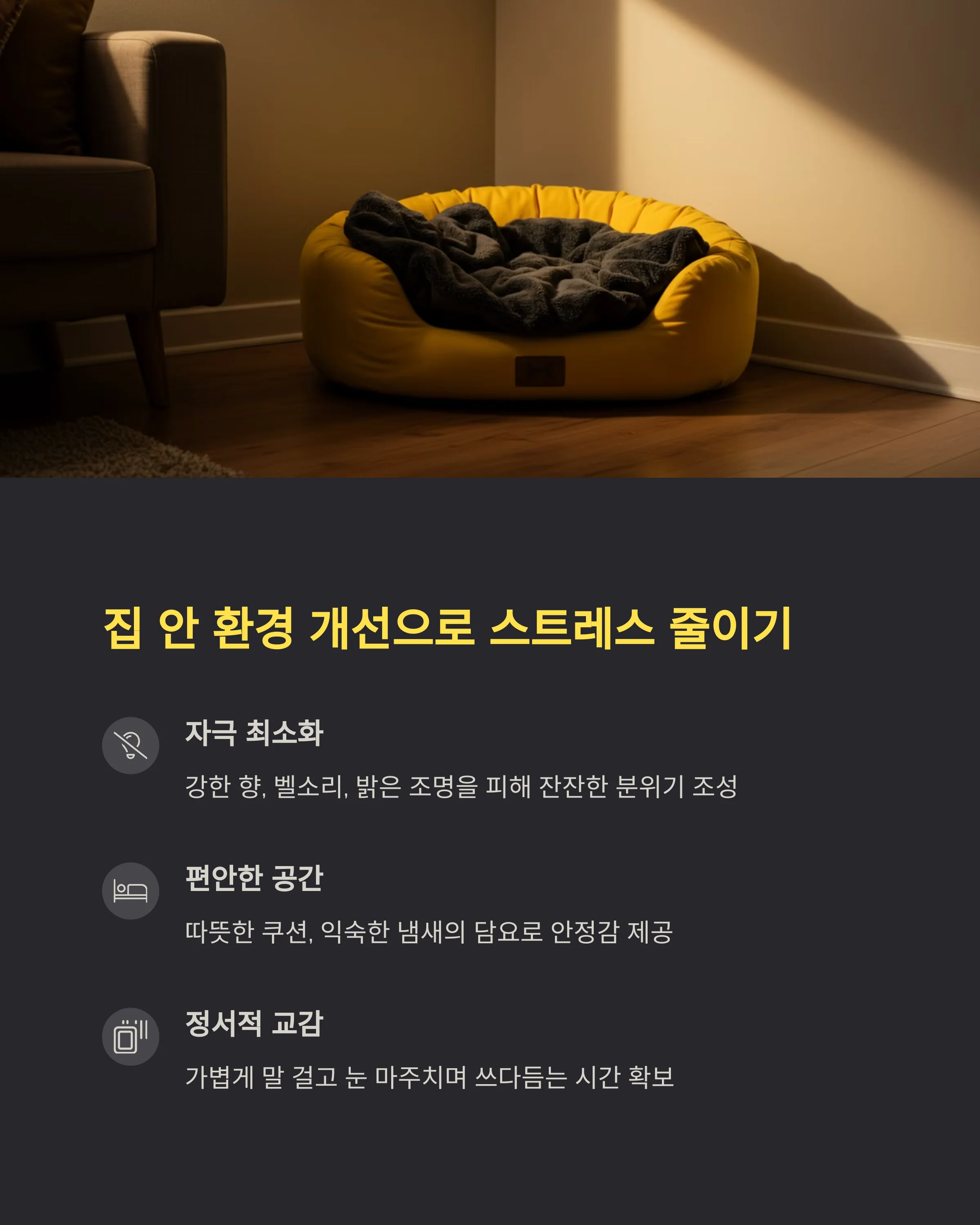 - 조용한 환경, 낮은 조명으로 안정감 제공
