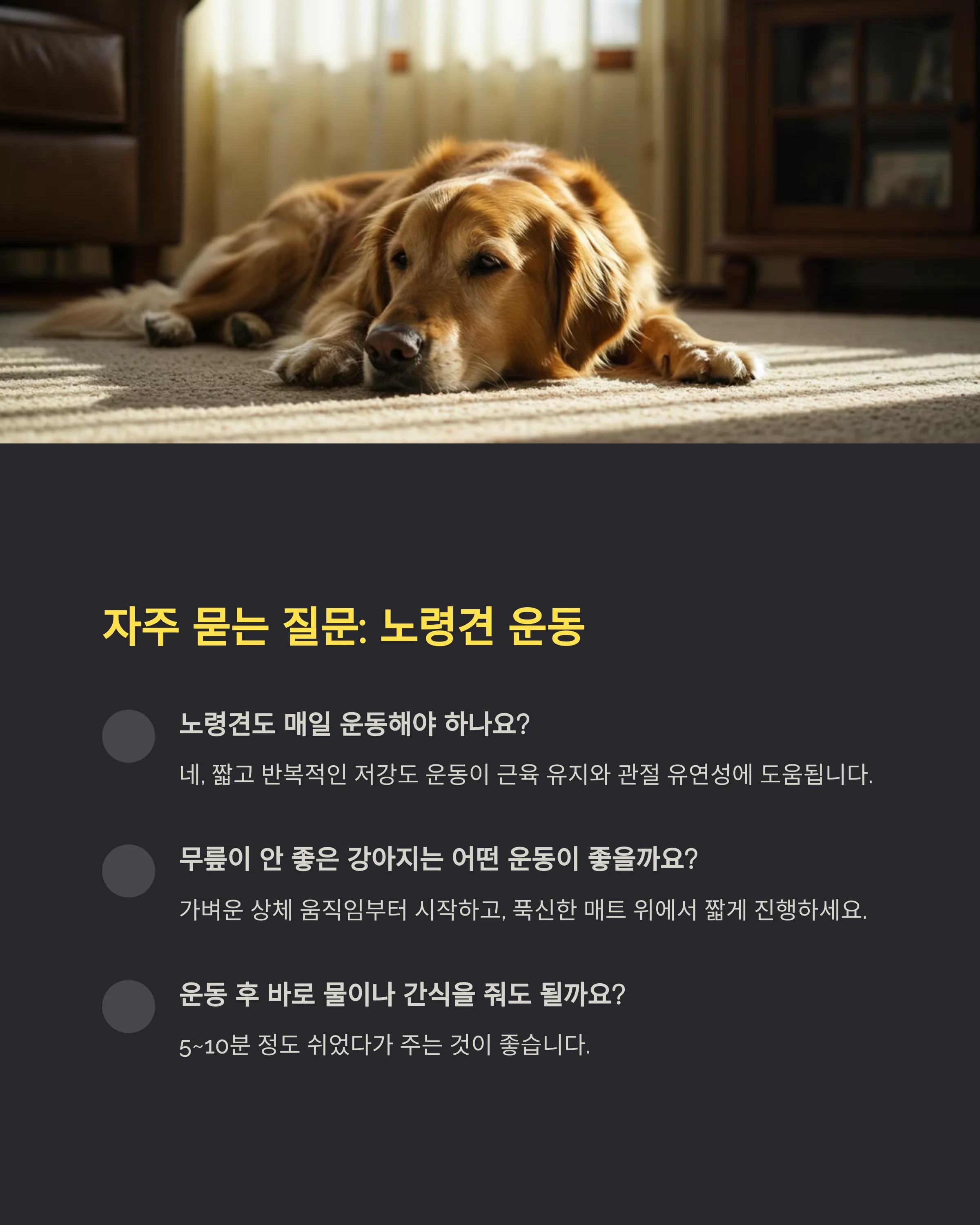 노령견은 하루 흐름이 예측 가능할 때 가장 편안해요. 기상 시간, 밥 주는 시간, 산책 시간, 수면 시간까지 고정된 패턴을 유지해주세요. “같은 시간에 산책 가자고 문 앞에서 기다려요.” 같은 반응이 생기면, 루틴이 잘 형성됐다는 뜻이에요.